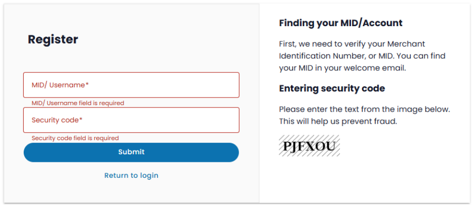 Important: All future communications for this account will be sent to the email address you provide. Security reminder Store your login details in a safe place for future access. Note: If this is your first time accessing the online PCI DSS portal you may be required to register. To do this, on the login page select “Register”. You will be prompted to enter the MID which was sent to you via email along with the associated security code. |