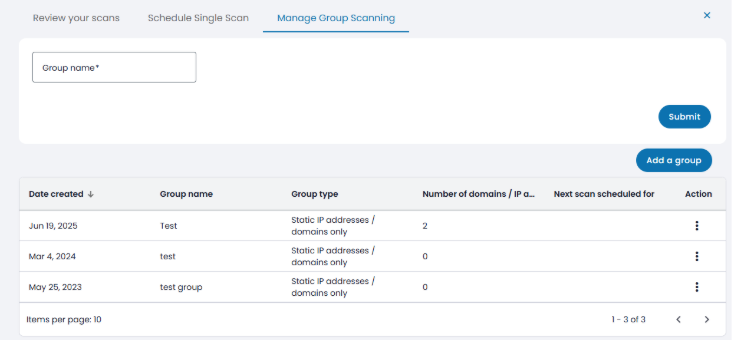 To set up your scan schedule – first you will need to create a group and add the IP addresses to that group. Once created you will then need to set up the scan schedule for that group.