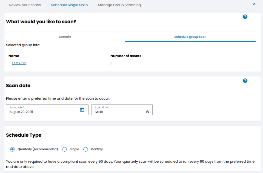 You can set up your recurring scan schedule to run either Quarterly or Monthly by choosing the option under “Scan Type”.