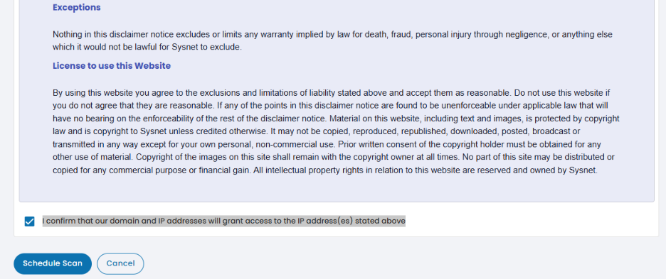 Once complete, review the rest of the information. Ensure and confirm that our scan IP addresses will be granted access to scan your IP address(es) so the scans run successfully. Finally, select “Schedule Scan”.